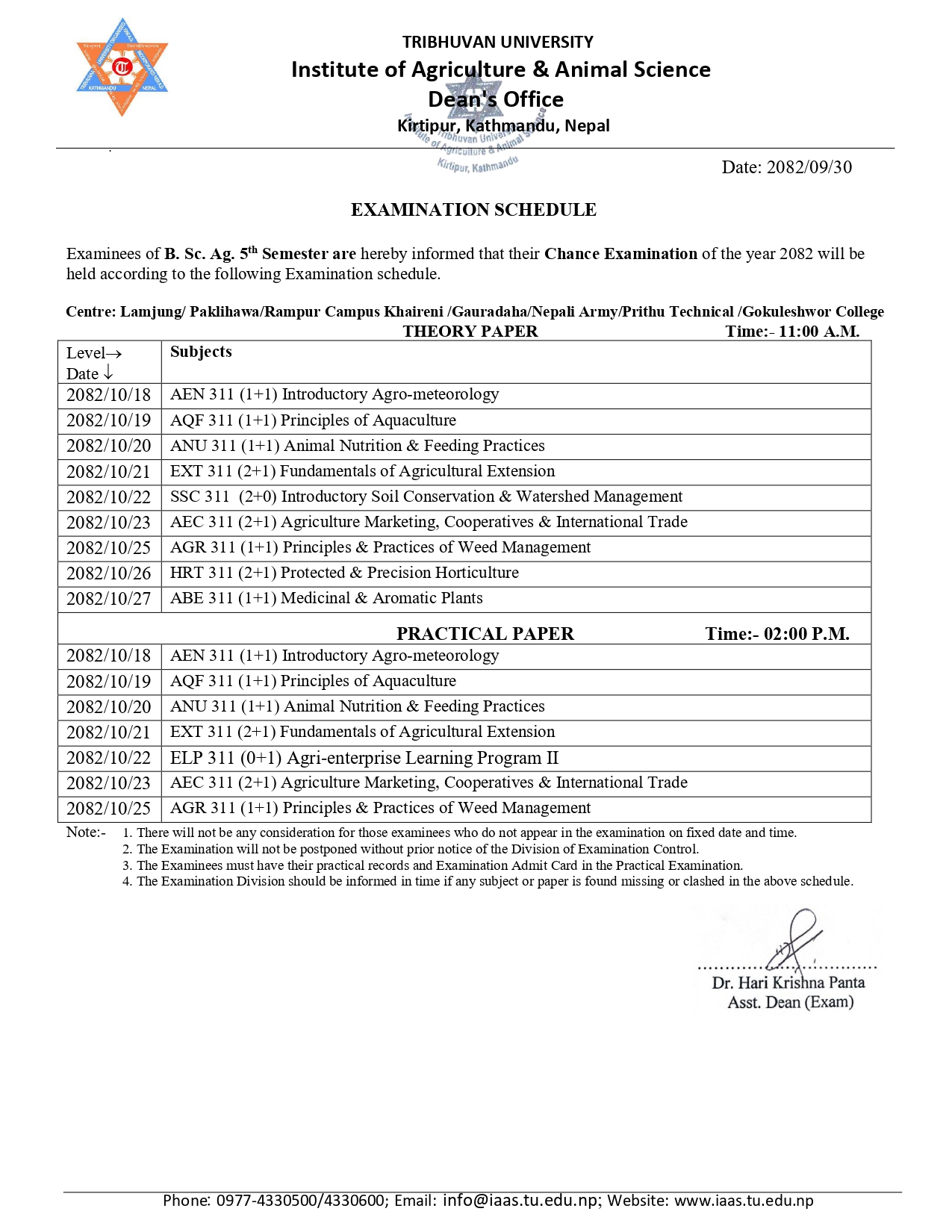 Examination Schedule of B.Sc.Ag 5th Semester (Chance Exam)