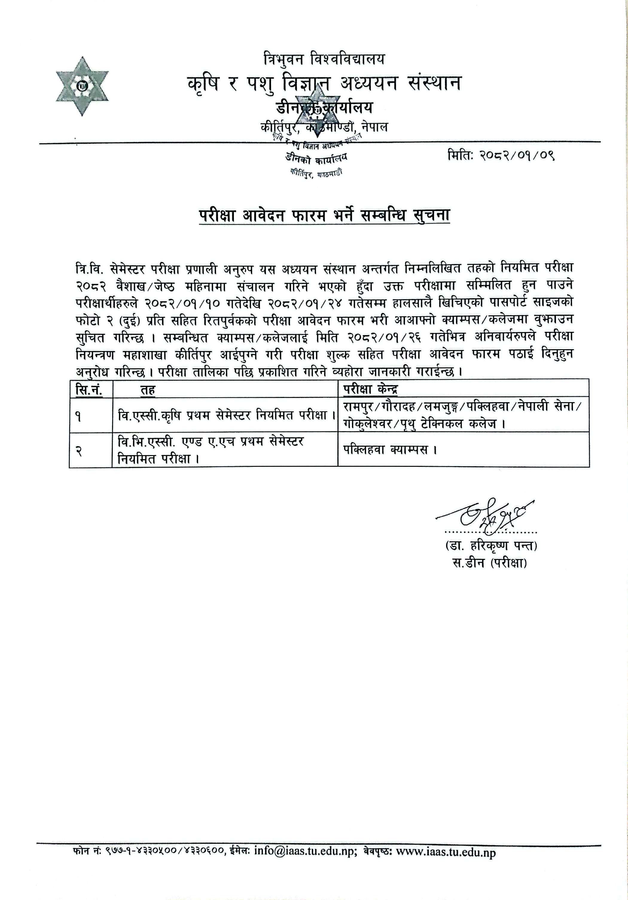 स्नातक तह कृषि प्रथम सत्रको परिक्षा आवेन फारम भर्ने सम्बन्धि सूचना