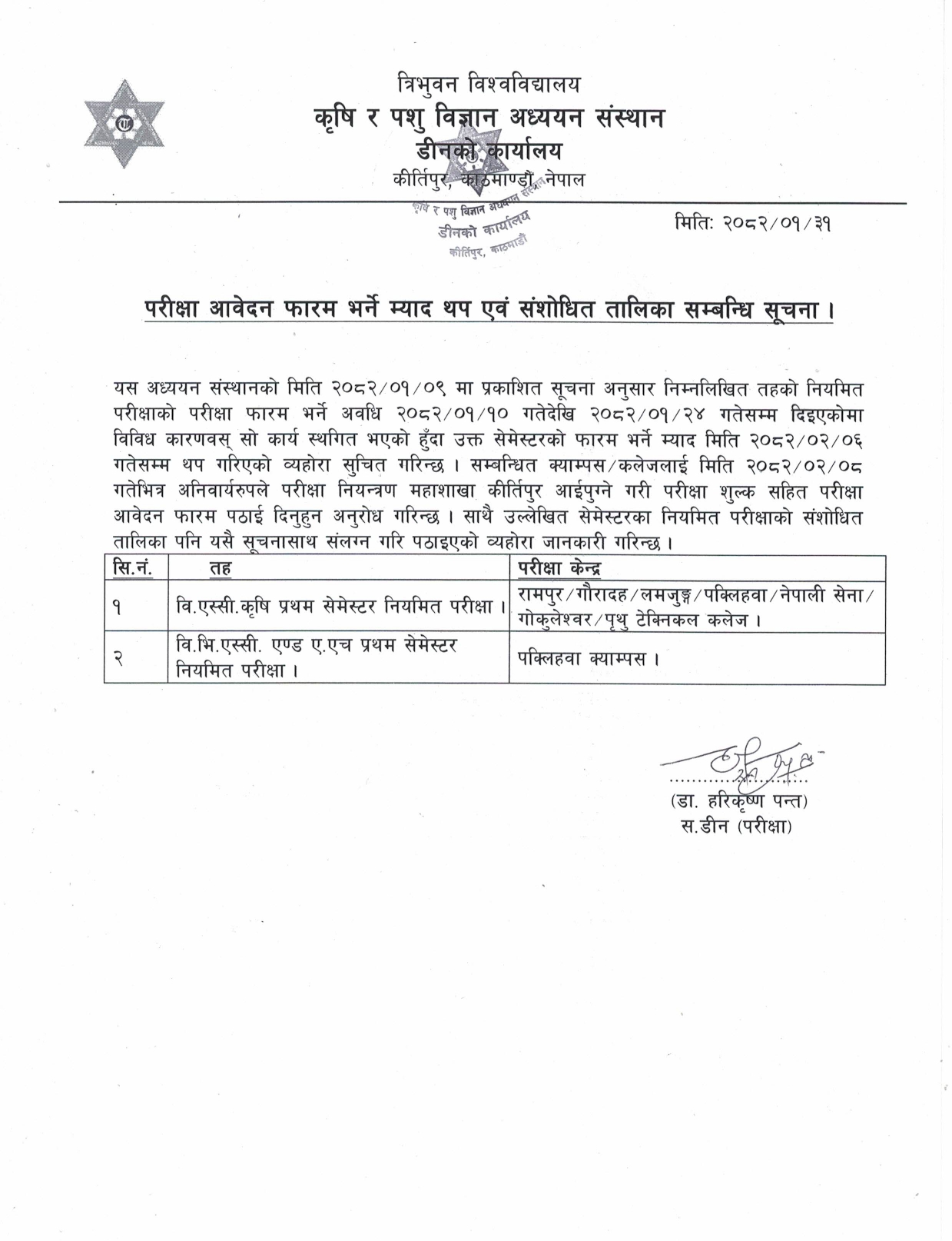 स्नातक तह कृषि प्रथम सत्रको परीक्षा आवेदन फारम भर्ने सम्बन्धि सूचना